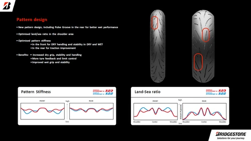 An updated pattern, incorporating the Pulse Groove Technology, contributes to the tyre’s impressive wet weather performance and outstanding dry grip and handling. The brand new edge compound allows for impressive feedback and cornering performance at high lean angle.