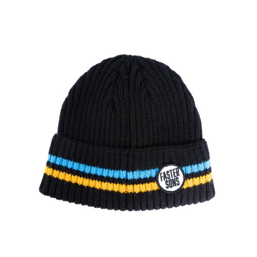 A simple yet bold design, the Faster Sons Beanie is a standout one-size-fits-all black hat, ideal for road trips and spending time in the great outdoors . Blue and yellow stripes run around the beanie, with Yamaha and Faster Sons branding identifying its undeniable Faster Sons heritage.