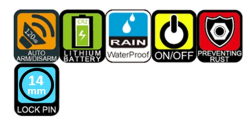 Weather-proof electronics module is fully protected by metal cover. By pressing down the button two times in 5 seconds, the alarm function will be off.