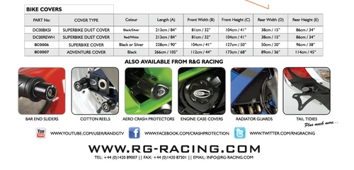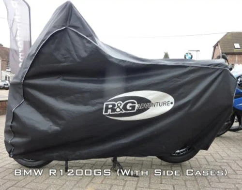R&G’s Superbike cover was awarded “Best Buy” by Ride Magazine (Dec ’08 issue) scoring a straight 21/21 points – what more can you ask for! And Winner of Product of the Year 2010 by BikeChatter. Features include: DURABLE WATERPROOF OUTER LAYER FRONT/REAR CHAIN LOOP FLAP ELASTICATED EDGING HIGH-VISIBILITY LOGO AND PIPING BELLY STRAPS WING MIRROR VENTS REAR LICENCE PLATE WINDOW WITH FLAP Capable of covering the largest of bikes even with the panniers still left on the bike! Including the BMW R1200GS, Yamaha Super Tenere, Ducati Diavel, BMW K1600, Triumph Tiger Explorer 1200, Honda Varadero, Honda Crosstourer (removal of side cases is required) and NC700 plus many more.